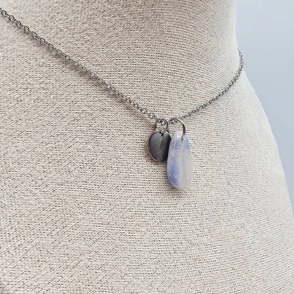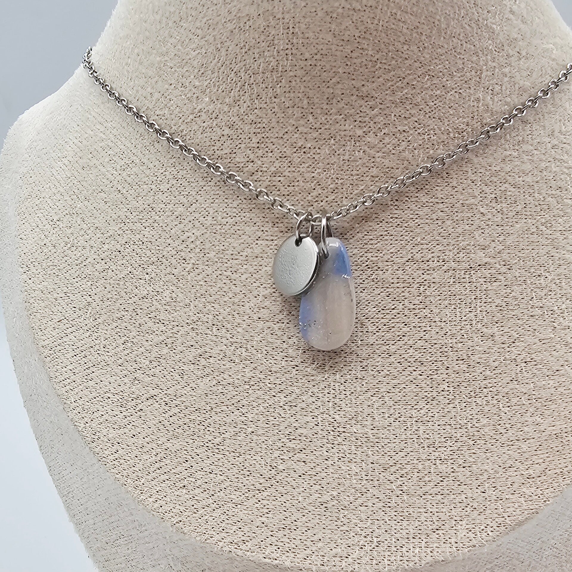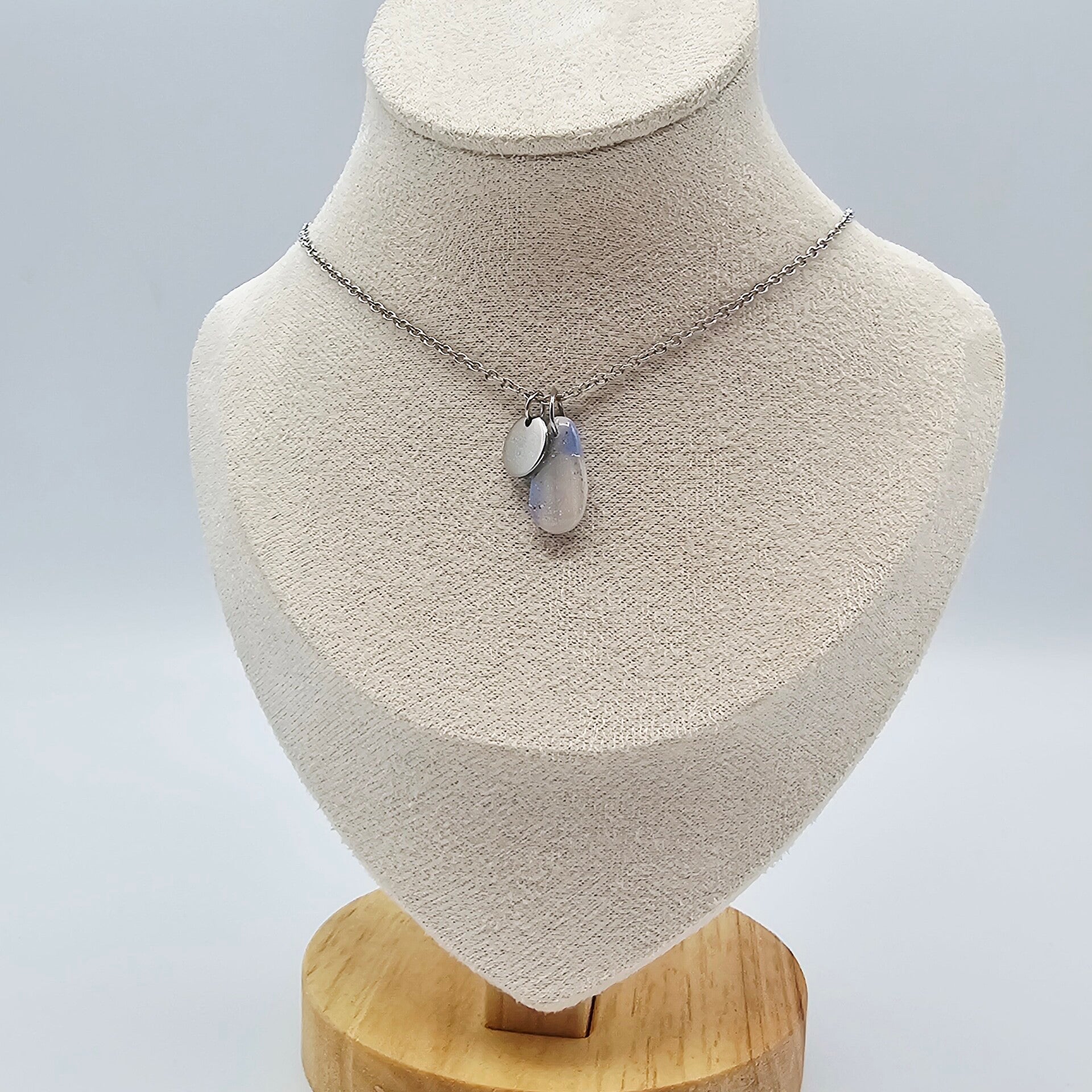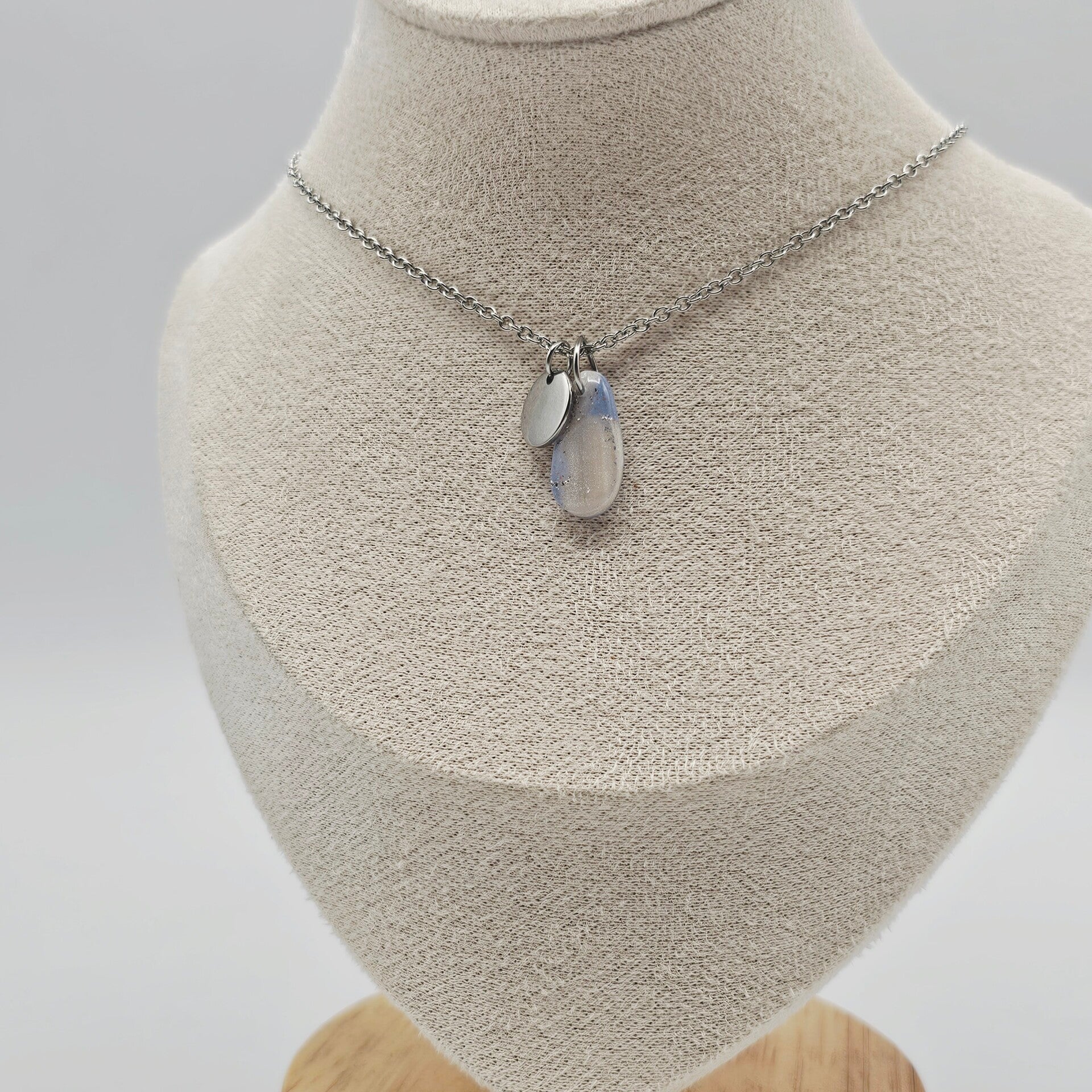 Diese Kette besticht durch den eleganten Tropfenanhänger aus hellblauem und perlmuttfarbenem Polymerton, welcher mit Silberfolieflocken verziert ist.