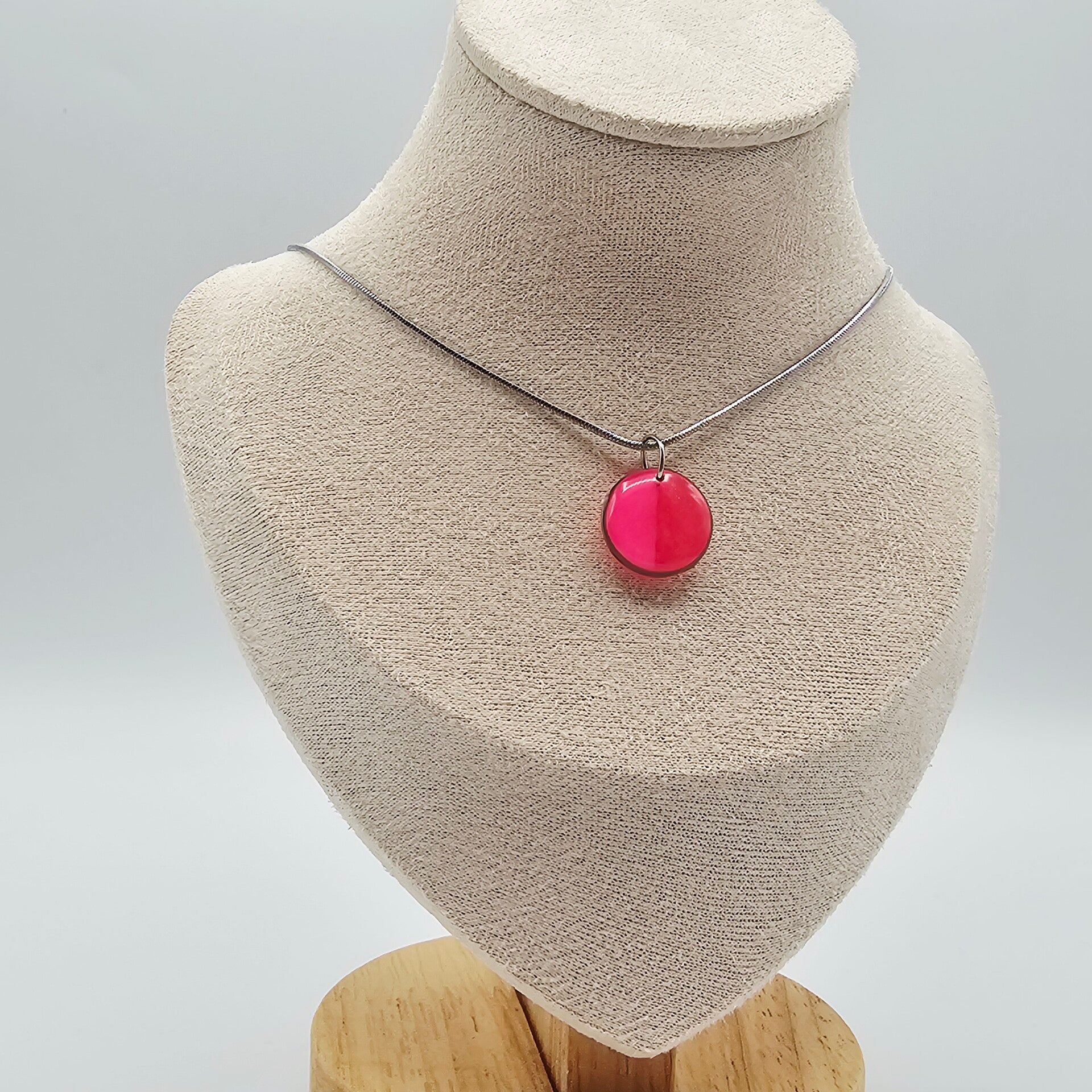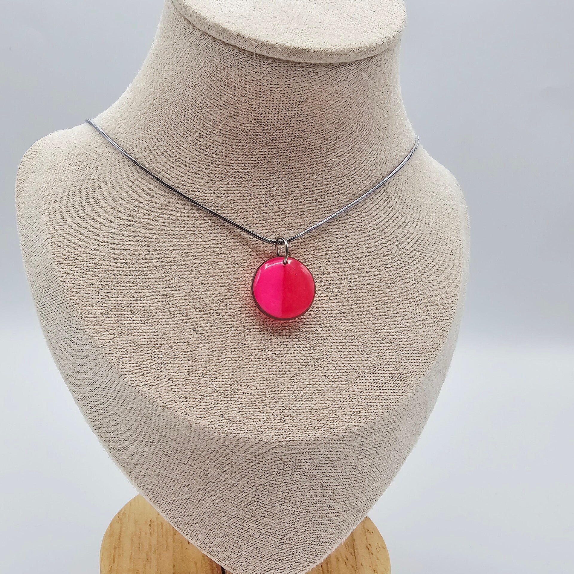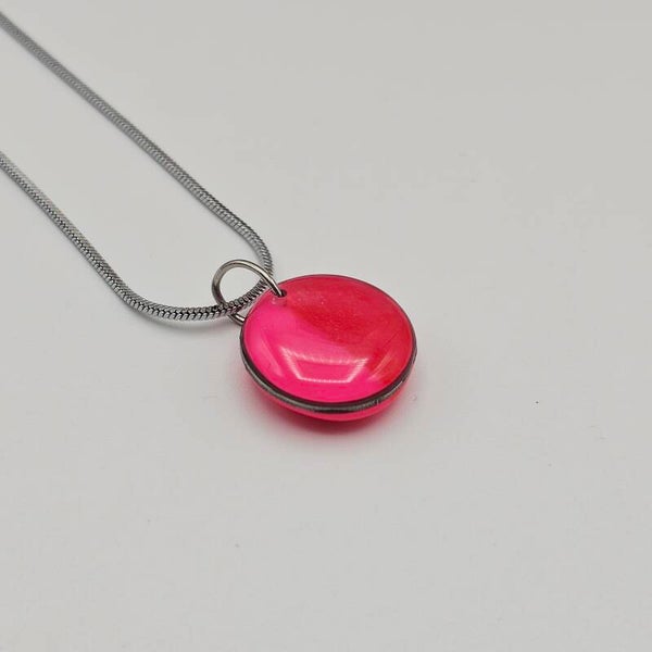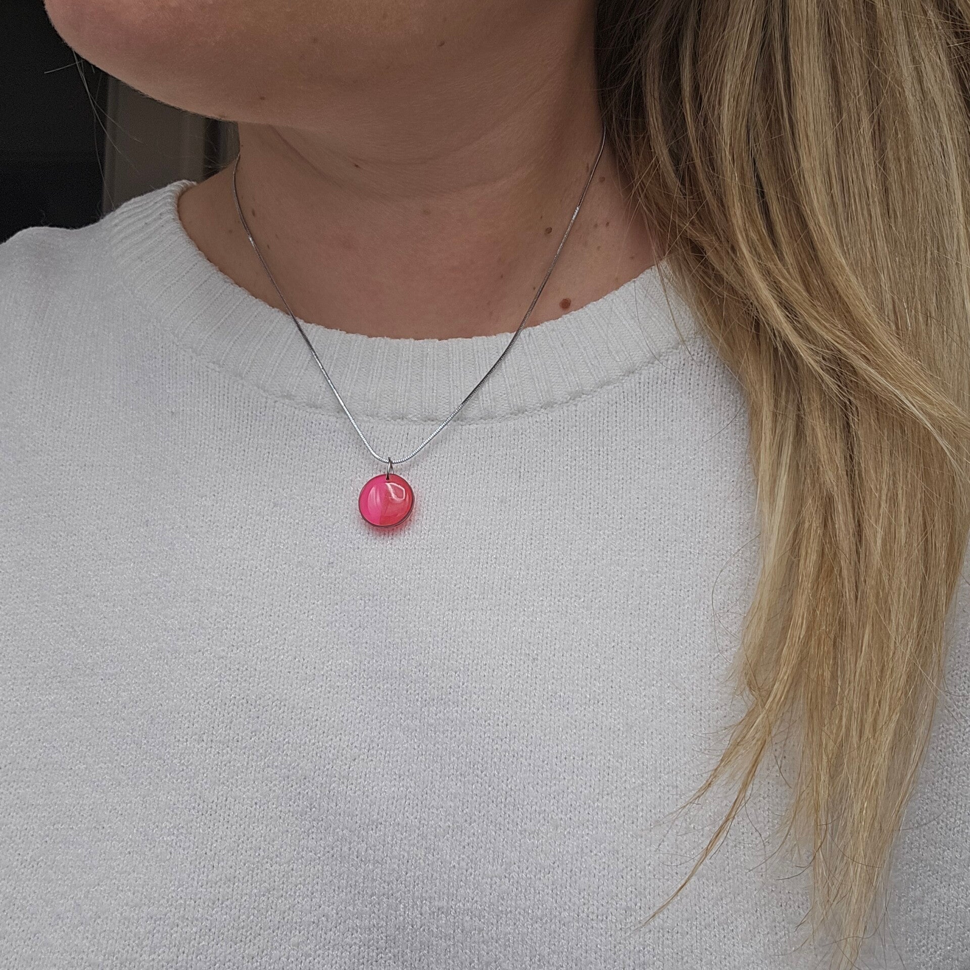 Diese Kette besticht durch den auffälligen runden Anhänger in der Farbe Pink, welcher aus Polymer-Ton hergestellt ist. Dieses Schmuckstück ist der perfekte Begleiter für dein Basic-Outfit.