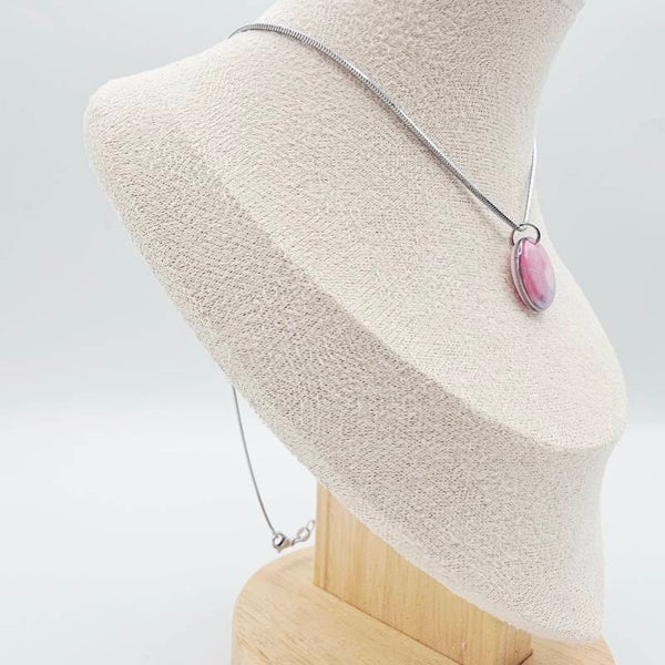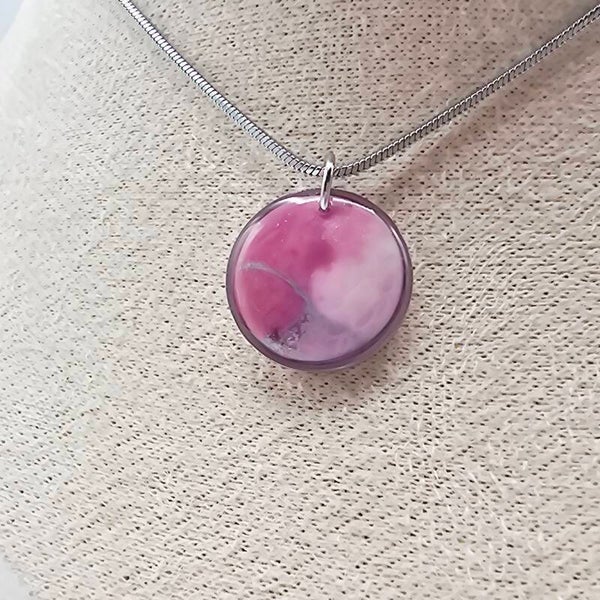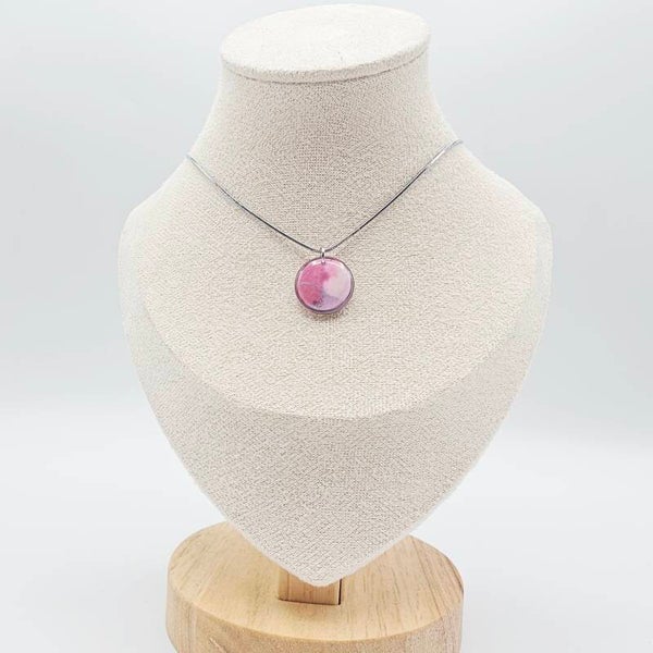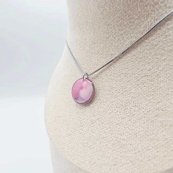 Diese Kette besticht durch den auffälligen runden Anhänger in den verschiedenen Pink/Rosa Farben, der Anhänger ist aus weißem Polymer-Ton hergestellt und mit Acrylfarben verziert. Dieses Schmuckstück ist der perfekte Begleiter für dein Basic-Outfit.