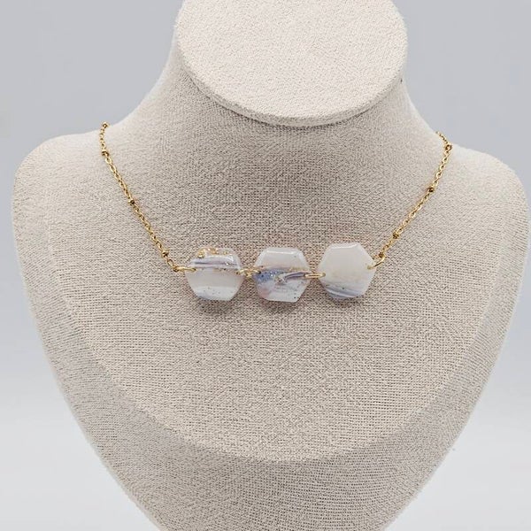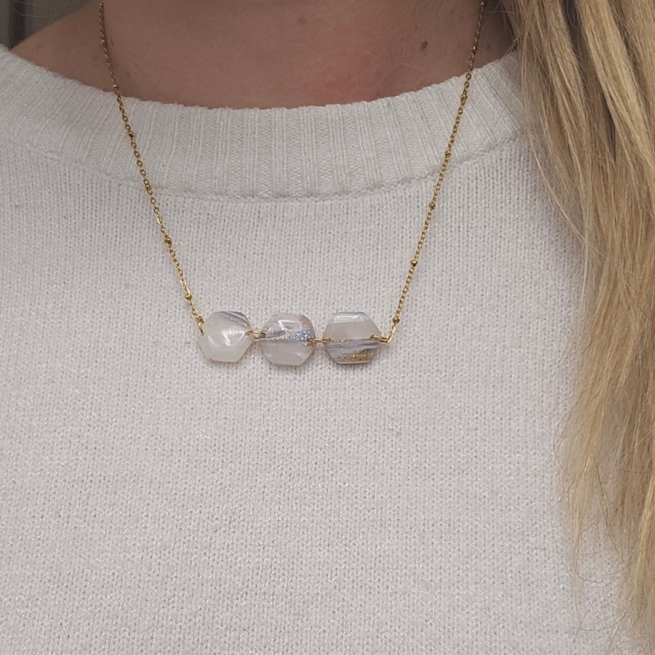 Diese vergoldete Edelstahlkette besticht durch die Hexagon Anhänger in den Farben Weiß/Hellblau/Rosa & Transparent mit Goldfolieflocken. Dieses Schmuckstück ist der perfekte Begleiter für dein Basic-Outfit.