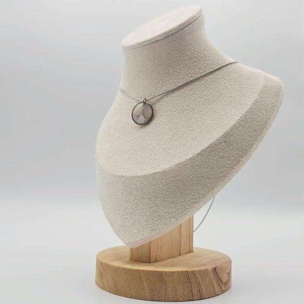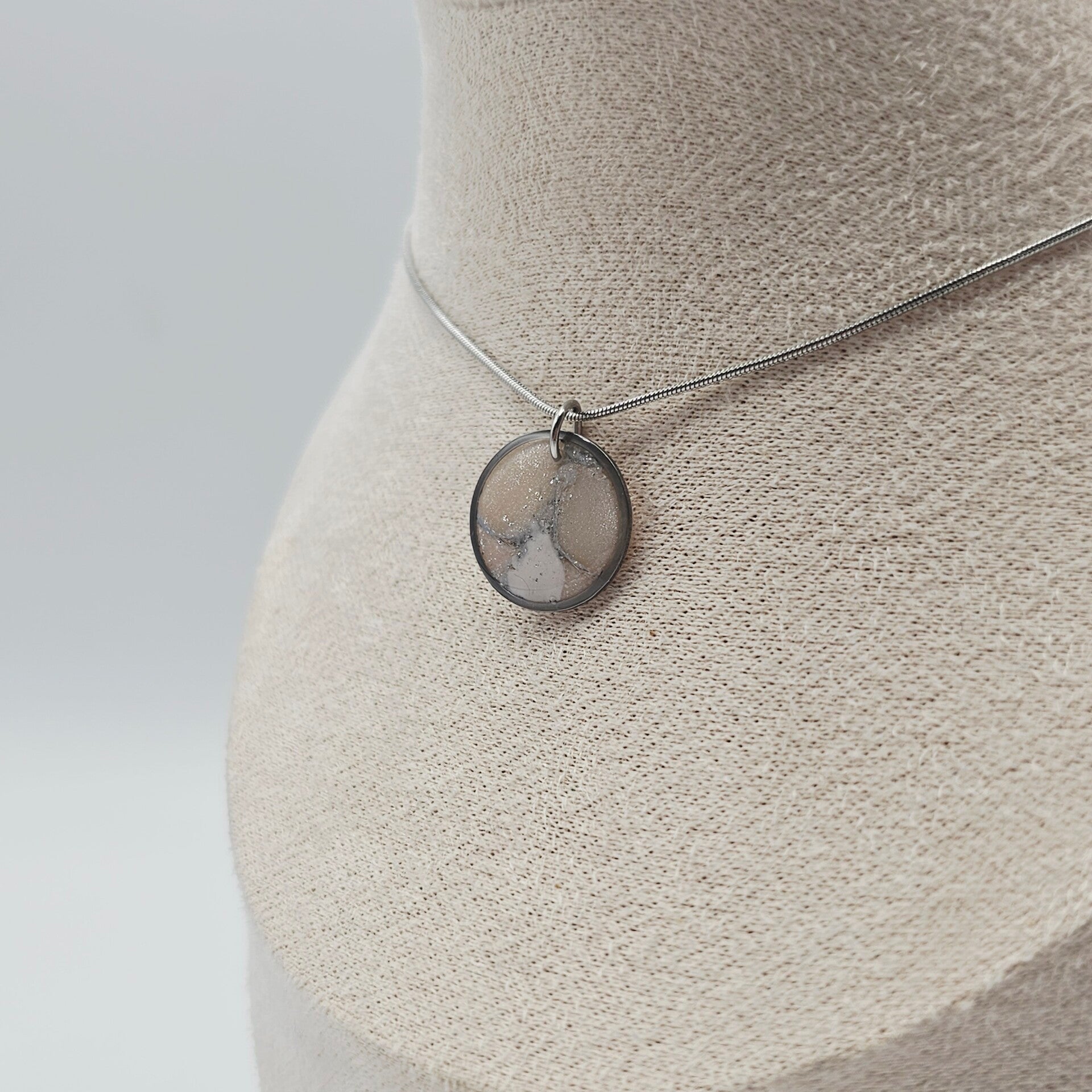 Diese Schlangenkette überzeugt mit einem runden Anhänger aus weißem, transparentem Polymer und feinen Silberflocken – ein edler Akzent für jedes schlichte Outfit.