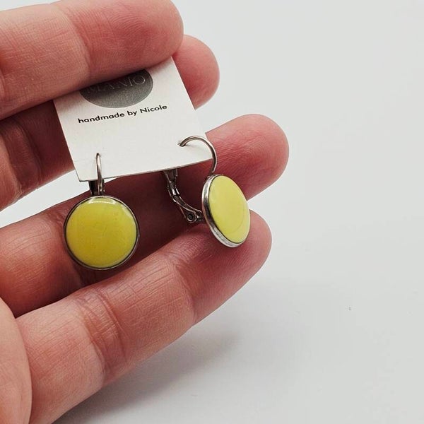 Die runden Anhänger bestehen aus hochwertigem Polymerton in einem leuchtenden Gelbton, eingefasst in glänzendem Edelstahl. Dank des robusten Materials sind sie leicht, hautfreundlich und langlebig – perfekt für den täglichen Gebrauch.
