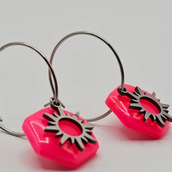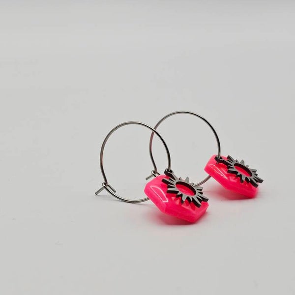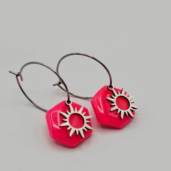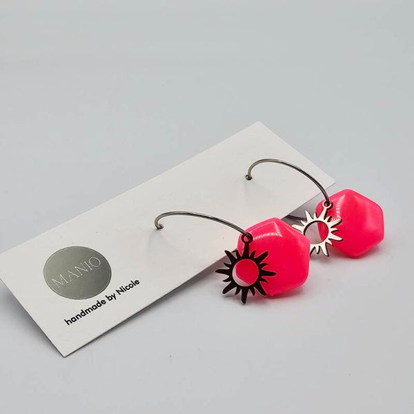 Diese leuchtenden Ohrringe sind ein echter Blickfang! Die pinkfarbenen Anhänger aus hochwertigem Polymer-Ton sind in einer modernen, sechseckigen Form gestaltet und mit filigranen Edelstahl-Sonnen verziert. Die Kombination aus kräftiger Farbe und elegantem Metalldetail sorgt für ein einzigartiges, fröhlich-modernes Design – perfekt für alle, die gerne auffallen und Farbe tragen.