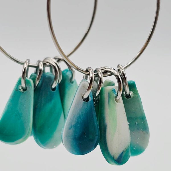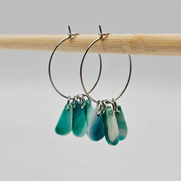 Diese handgefertigten Ohrringe bringen frische Farben und Leichtigkeit in deinen Look! Mehrere tropfenförmige Anhänger aus Polymer-Ton in harmonischen Blau-, Grün-, Weiß- Türkistönen aus Acrylfarben hängen an silberfarbenen Creolen. Feine silberne Details verleihen den Tropfen einen eleganten Schimmer. Das Design erinnert an das Meer – perfekt für alle, die natürliche Farben und moderne Formen lieben.