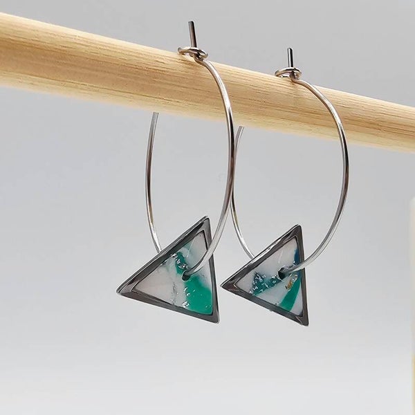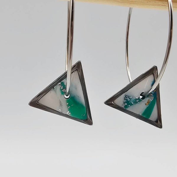 Diese geometrischen Ohrringe vereinen klare Linien und frische Farben zu einem modernen, stilvollen Design. Die dreieckigen Anhänger bestehen aus handgearbeitetem Polymer-Ton in Weiß- und Türkistönen, veredelt mit feinen gold-& silberfarbenen Akzenten. Eingefasst in eine silberfarbene Metallfassung wirken sie elegant und gleichzeitig lebendig – perfekt für Liebhaber:innen von minimalistischer, handgefertigter Schmuckkunst.