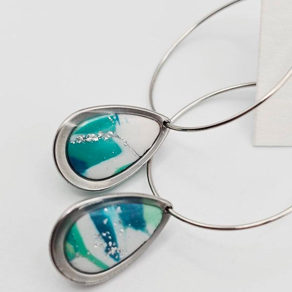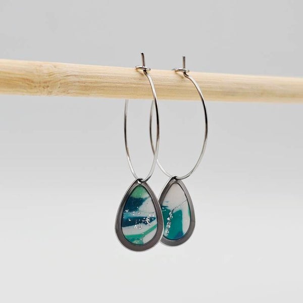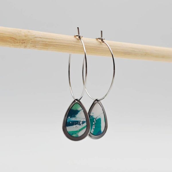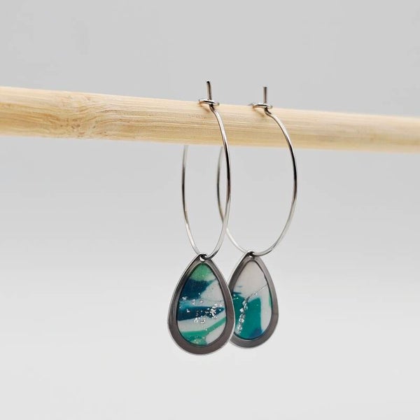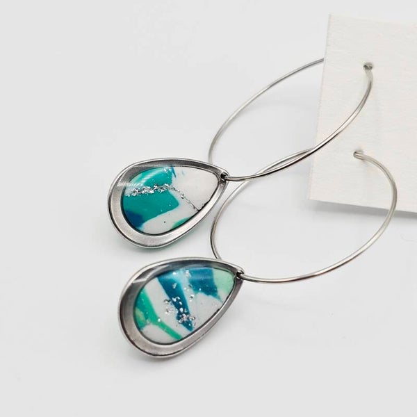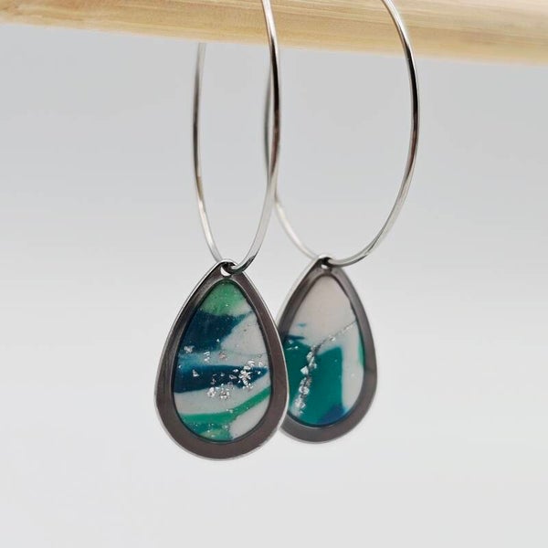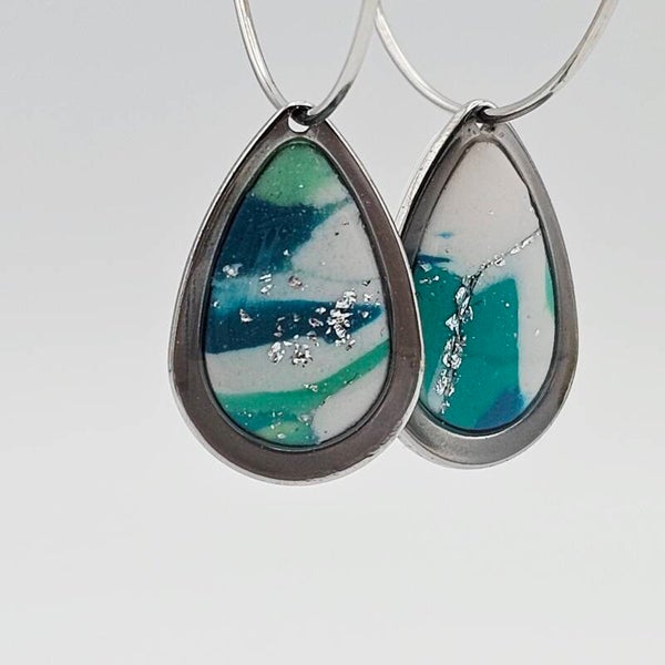 Diese eleganten Ohrringe vereinen schlichte Formen mit einem einzigartigen Farbspiel. Die tropfenförmigen Anhänger aus Polymer-Ton zeigen eine harmonische Kombination aus Blau-, Grün- und Weißtönen, veredelt mit feinen silberfarbenen Akzenten. Eingefasst in eine silberne Metallfassung und aufgehängt an schlichten Creolen wirken sie modern, frisch und zeitlos – perfekt für alle, die handgefertigten Schmuck mit Stil lieben.