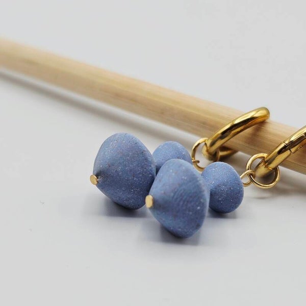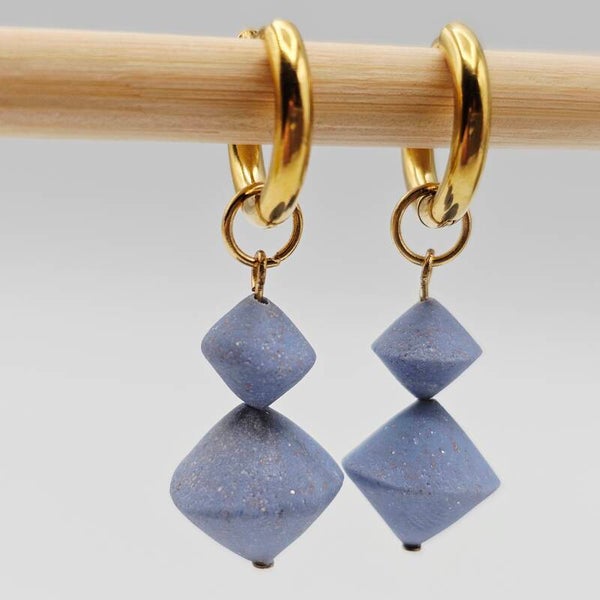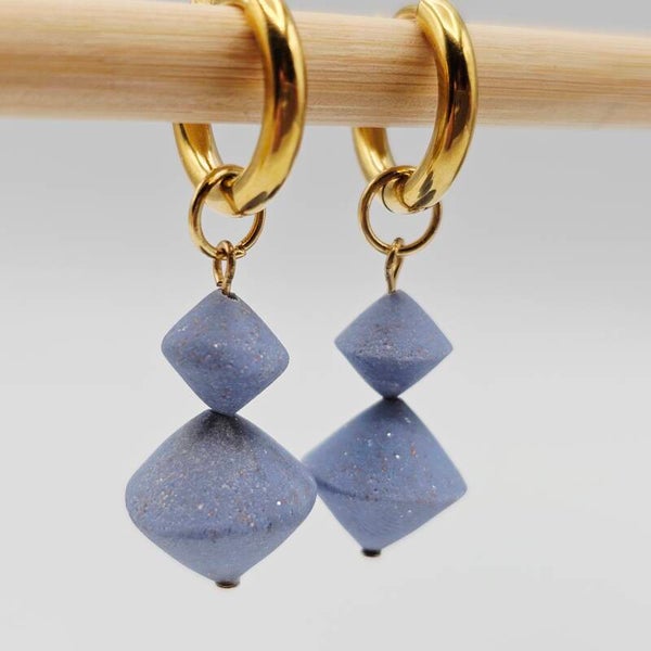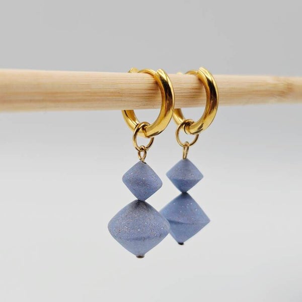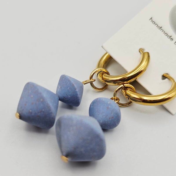 Diese modernen Ohrringe vereinen klare Formen mit elegantem Farbspiel. Die handgefertigten Anhänger aus Polymer-Ton in einem matten Blauton erinnern an natürliche Steintexturen und hängen an glänzenden, goldfarbenen Creolen. Durch das Zusammenspiel von geometrischem Design und warmem Gold entsteht ein stilvoller Look – perfekt für Alltag und besondere Anlässe.