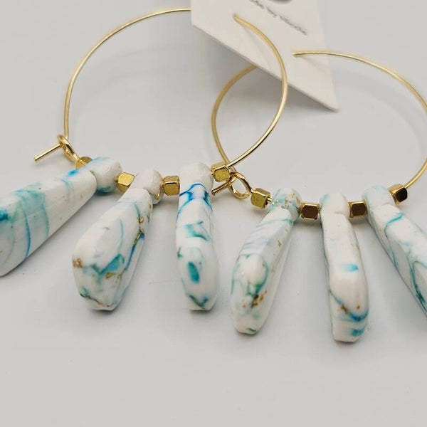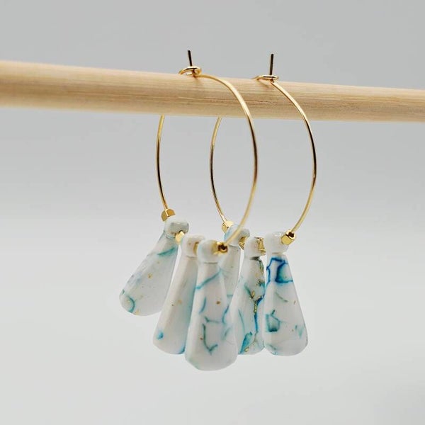 Diese eleganten Ohrringe vereinen Leichtigkeit, Bewegung und dezente Eleganz. Die handgefertigten Anhänger aus Polymer-Ton sind in sanftem Weiß mit feinen blauen/türkisen Muster gestaltet, die an Marmor erinnern. Kleine goldene Akzente verleihen dem Design einen edlen Schimmer. Durch die goldfarbenen Creolen entsteht ein moderner, femininer Look – perfekt für Alltag, Büro oder besondere Anlässe.