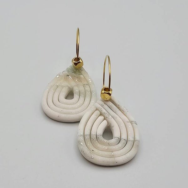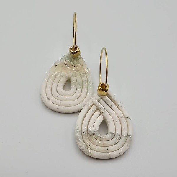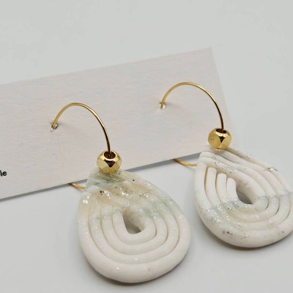 Diese Ohrringe bestechen durch ihre harmonische Form und schlichte Eleganz. Die tropfenförmigen Anhänger aus Polymer-Ton sind in sanftem Cremeweiß mit einem zarten, grünen & silberfarbenem Schimmer gestaltet. Die goldfarbenen Creolen verleihen dem Design einen modernen, femininen Touch – perfekt für Alltag und besondere Anlässe.