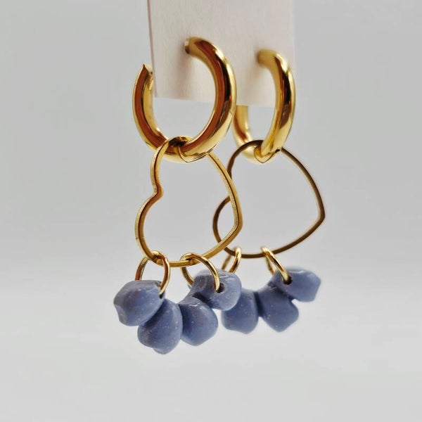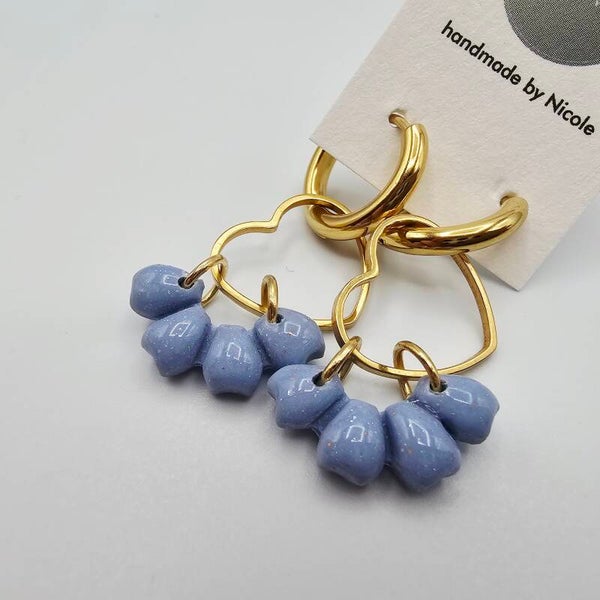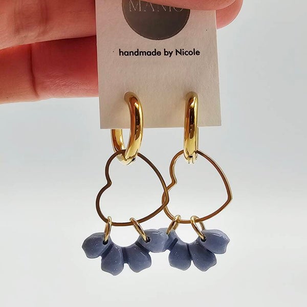 Diese bezaubernden Ohrringe in Herzform vereinen romantisches Design mit modernem Charme. Die goldfarbenen Edelstahl-Herzen wirken elegant und leicht, während die zarten blauen Blütenanhänger aus Polymerton für einen verspielten & eleganten Akzent sorgen.