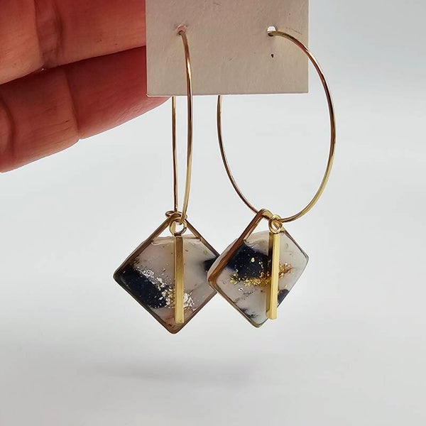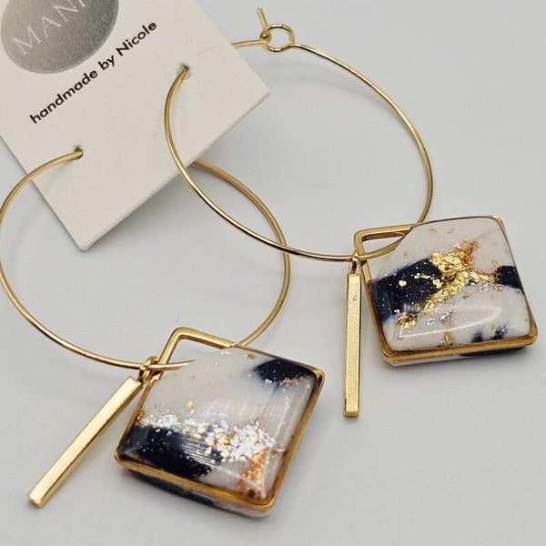 Die quadratischen Anhänger aus Polymerton zeigen eine faszinierende Marmoroptik in sanften Naturtönen und blauen Akzenten mit feinen gold-, rosé & silberfarbenen Akzenten die jedes Paar zu einem kleinen Kunstwerk machen.