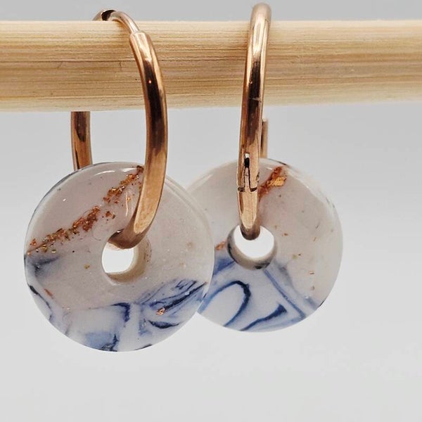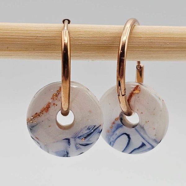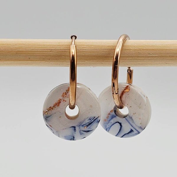 Diese feinen Kreisohrringe vereinen dezente Eleganz mit einem Hauch von Sommer. Die Anhänger aus Polymerton zeigen eine wunderschöne Marmorstruktur in Blau und Weiß, veredelt mit zarten gold- & roséfarbenen Details.