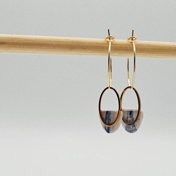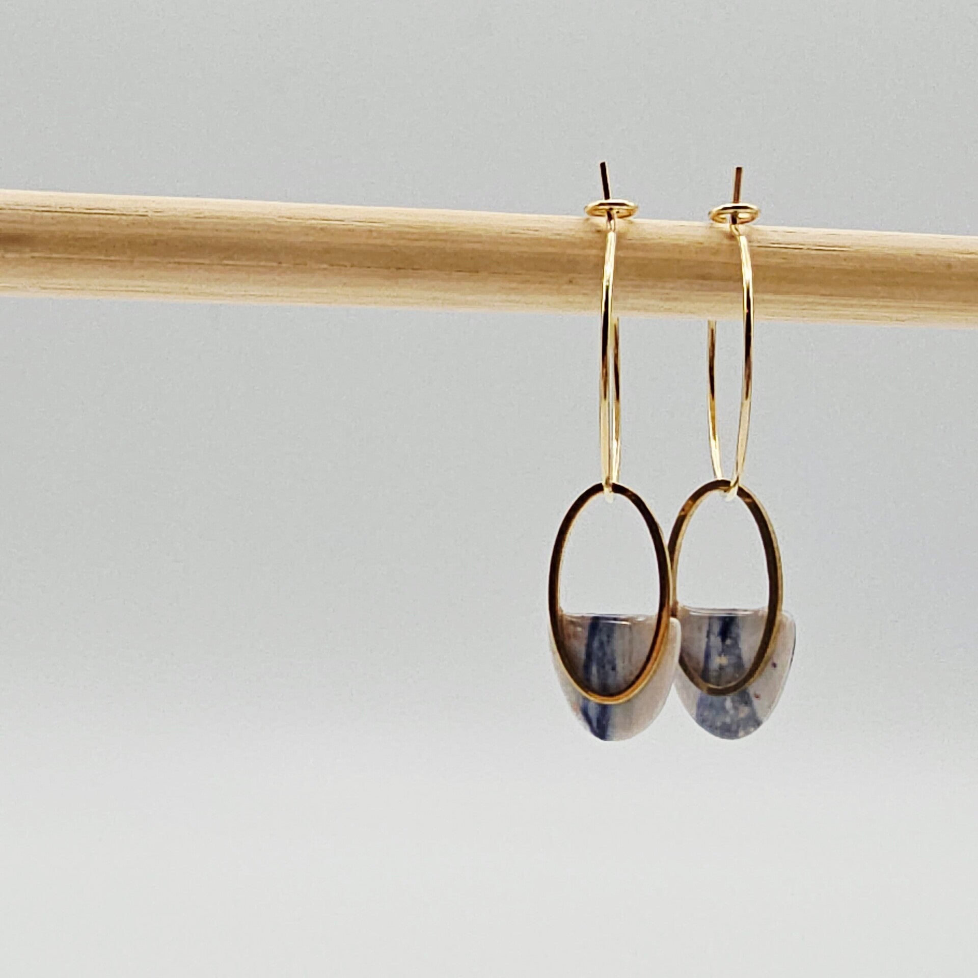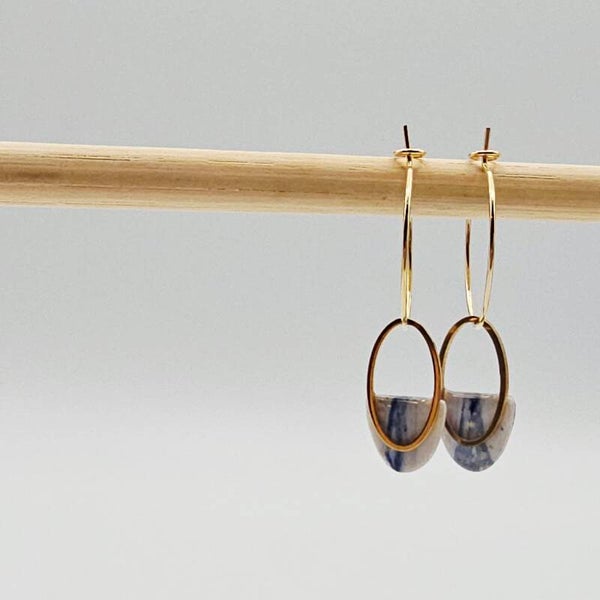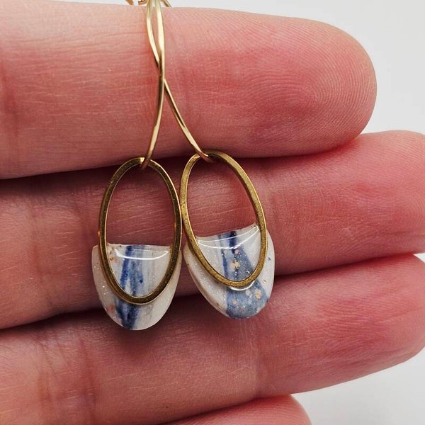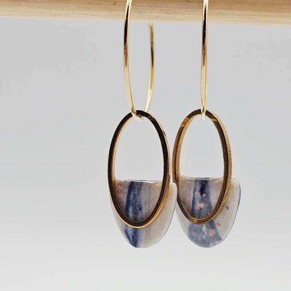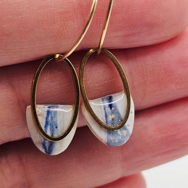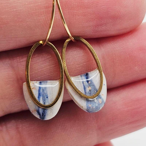 Diese feinen Ohrringe vereinen modernes Design mit einem Hauch maritimer Eleganz. Die Anhänger aus Polymerton zeigen eine zarte Marmorierung in Weiß und Blau, veredelt mit feinen gold- und roséfarbenen Partikeln. Ein eleganter goldener Edelstahlrahmen ergänzt die Form und sorgt für eine zeitlose, edle Ausstrahlung.