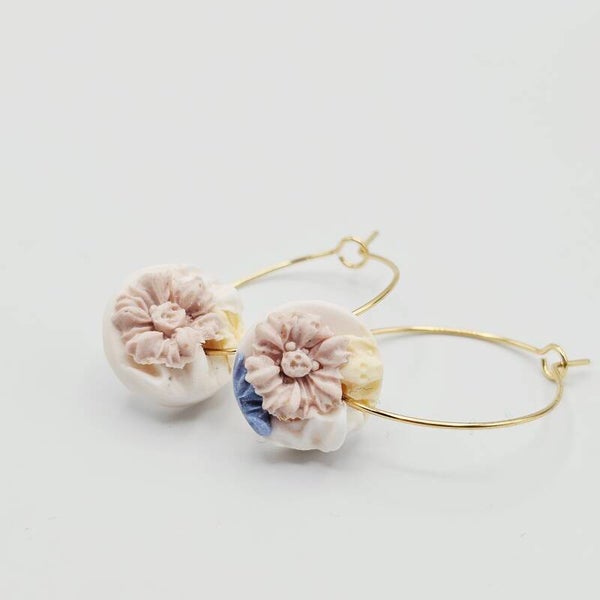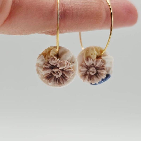 Diese liebevoll handgefertigten Blumenohrringe vereinen natürliche Schönheit mit feinen Details. Die runden Anhänger aus Polymerton zeigen filigrane Blüten in sanften Creme- und Pastellgelb- Hellblau & Rosatönen, die an getrocknete Sommerblumen erinnern. Die goldfarbenen Edelstahlbügel ergänzen das Design mit einem eleganten, warmen Glanz.