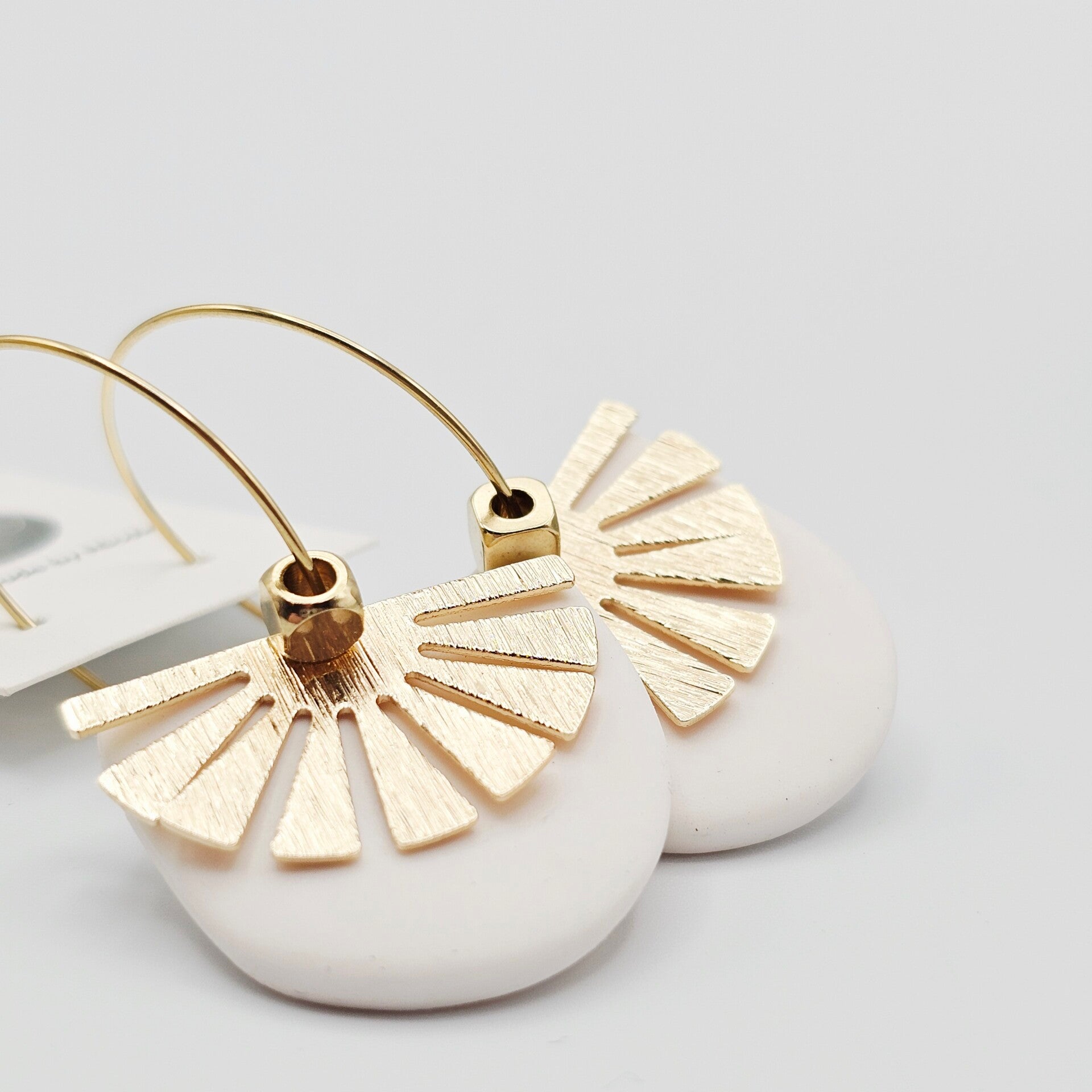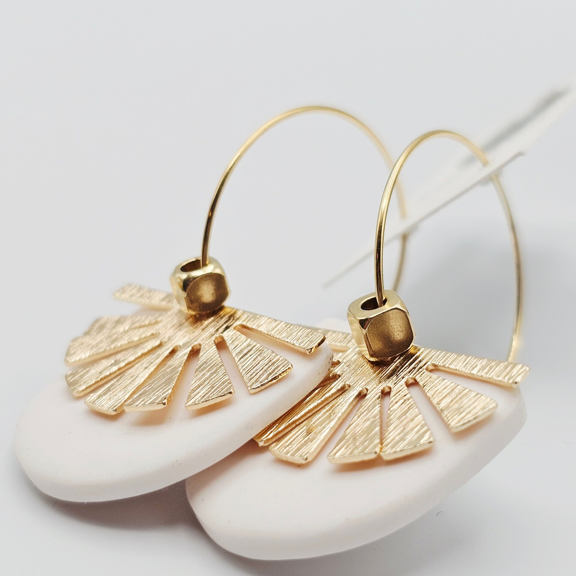 Diese stilvollen Halbkreis-Ohrringe bringen modernes Design und sonnige Leichtigkeit in perfekten Einklang. Die Anhänger aus Polymerton in sanftem Weiß bilden die Basis für das auffällige Fächer-Element aus goldfarbenem Edelstahl, welcher edel schimmert und jedem Outfit einen Hauch Eleganz verleiht.